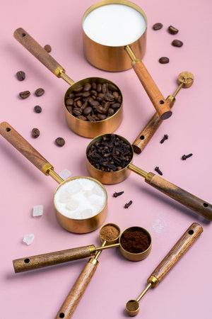 Stylish arrangement of coffee beans, ground coffee, sugar, and milk in elegant measuring cups, showcasing the essentials for a perfect brew.