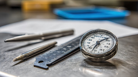 This close-up image features measurement tools including a gauge, ruler, and pens on a metal surface, ideal for engineering and design projects.