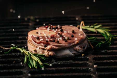 Fresh raw pork neck for steak with herb spices on a barbecue grill. Beef meat steaks.