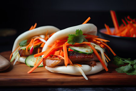 bao bun with slow-roasted pork belly, pickled vegetables, and sriracha, created with generative ai
