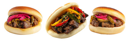Grilled beef sandwich or spicy Alexandrian liver sandwich with bell peppers and chili sauce in soft bun, isolated on white transparent background, concept of fast food
