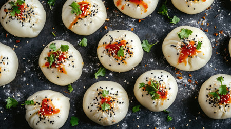 Mouthwatering steamed buns filled with tender, spicy beef, garnished with sesame seeds, fresh herbs, and chili. ideal for showcasing asian culinary delights, recipe illustrations, or promoting food events emphasizing gourmet cuisine. Generative AI