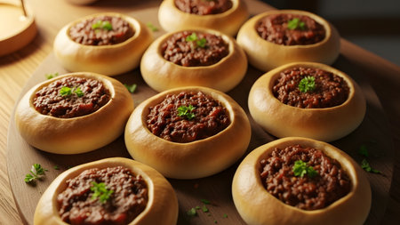 Freshly baked bread rolls with savory filling on a wooden board in a cozy kitchen setting
