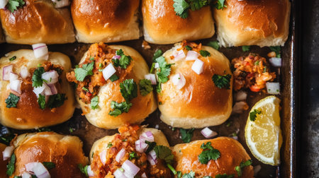 A close-up of delicious kheema pav, spicy minced meat served in a soft bun with onions and lemon, fresh from a street vendor in India.
