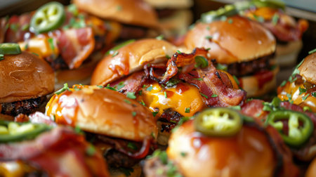A tray of mini sliders with different toppings, including bacon and pepper jack cheese.