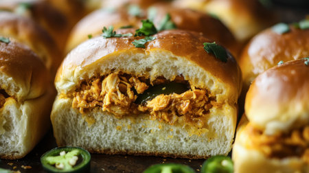 This image showcases a fluffy bread roll filled with spicy chicken and herbs, perfect for snacks or meals. Ideal for culinary inspiration and appetizing recipes.