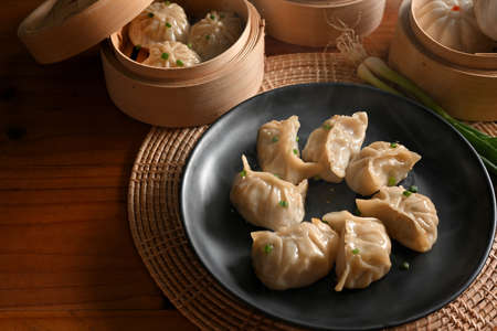 steamed dumpling baozi in bamboo steamer on wooden table