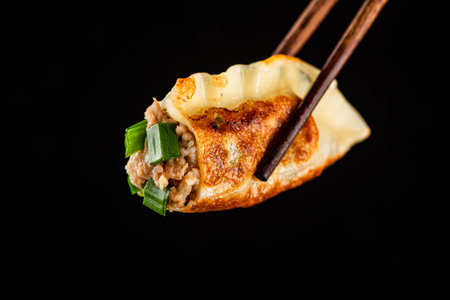 Savor a plate of delicious dumplings, perfectly grilled and served with chopsticks. The inviting presentation and vibrant flavors make this dish irresistible.