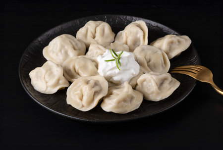 Traditional Russian pelmeni, ravioli, dumplings with meat on black background.