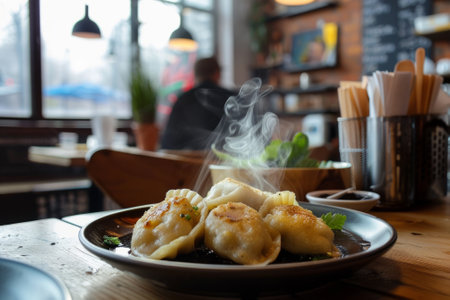 In a contemporary cafe, Polish steamed fried dumplings sit on a wooden table