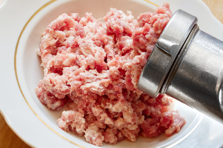 A dynamic scene showcases the meat grinding process, capturing fresh raw meat spilling from a metal bowl, evoking culinary creativity and kitchen action.