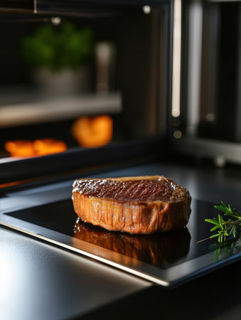 A 3D food printer is producing a plant-based steak, showcasing modern culinary technology in a sleek kitchen environment.