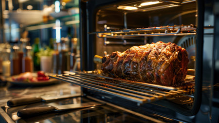 Close Up of Prime Rib Roasting in the Oven for a holiday meal