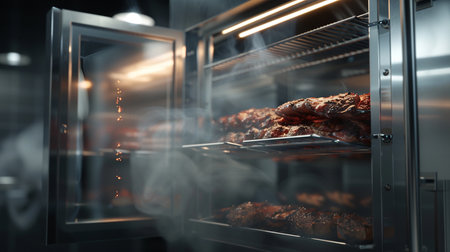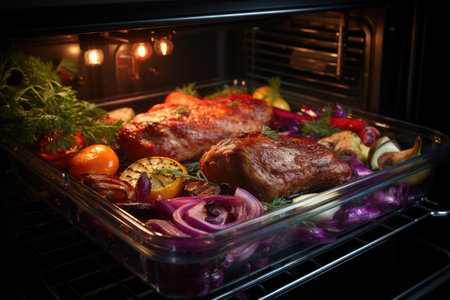 oven with warm glow and steam escaping, ready for baking or roasting, created with generative ai