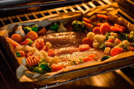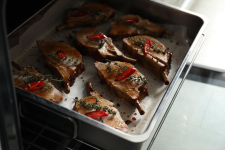 Grilled salmon steaks cooking in the oven on parchment paper. Close-up food photography with warm lighting. Healthy seafood meal preparation.