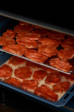 Sliced carrots in the oven on a protvin for cooking carrot bacon. Vegetarian food, meat replacement, vegetable protein