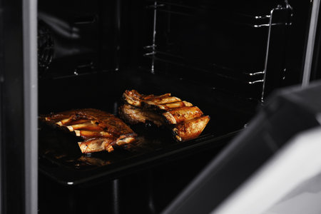 hand removing bbq ribs from oven with oven mitt, created with generative ai