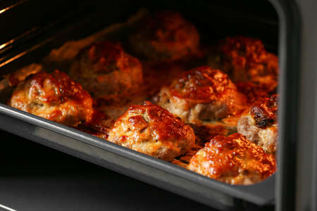 View into the oven on the baking tray for meatballs. Little light, light only from the oven. Shallow depth of field, blurred background.