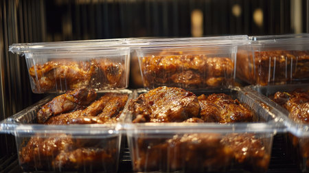 Marinated meat stored in food-grade containers inside industrial prep kitchen