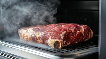 A piece of meat is cooking on a digital screen, with steam rising from it. Concept of futuristic technology and innovation in the culinary world