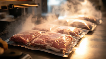 Fresh meat portions in vacuum bags, steam from sealing mechanism fogging up the workspace