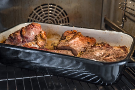 Real hearty homemade roast pork in a roaster casserole in the oven, Germany