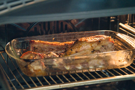Baked pork meat in the oven. Tomatoes, rosemary, metal baking sheet.