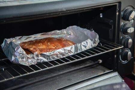 Spiced marinated pork leg meat wrapped in a baking sleeve in the oven close-up