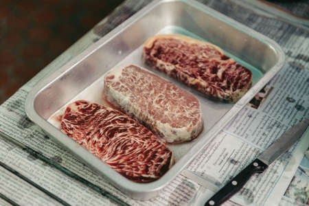 Defrost raw wagyu beef with marble texture that defrost on stainless steel plate in Bangkok, Thailand.