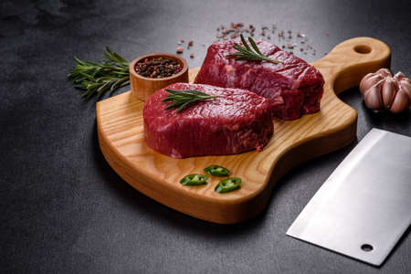 Raw beef steaks on a cutting board with spices on a stone background