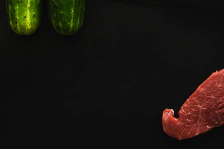 Fresh raw beef steak, meat with two green cucumbers on a black background, close up, copy space.