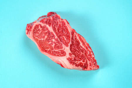 Bright raw beef steak on a blue background close up
