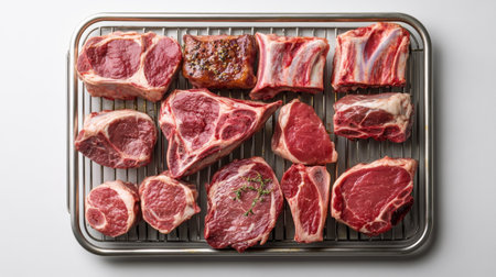 A visually appealing arrangement of fresh raw meat cuts on a clean white surface. Ideal for culinary, food preparation, and nutrition themes.