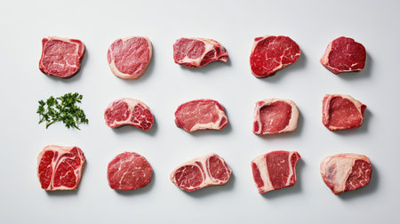 A visually appealing arrangement of fresh beef cuts on a light background, perfect for culinary projects or food-related designs showcasing quality meat.