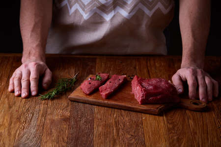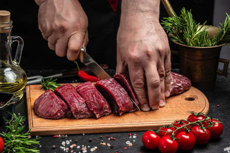 Man slicing filet mignon on wooden board at restaurant kitchen. Chef preparing fresh meat for cooking. Modern cuisine backgroung with herbs and vegetables, copy space