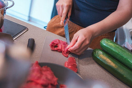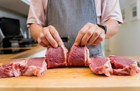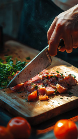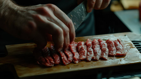 Close-up of hands expertly slicing fresh raw meat on a wooden cutting board in a kitchen. Ideal for culinary content and food preparation themes.
