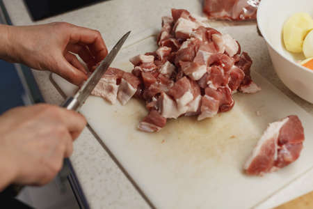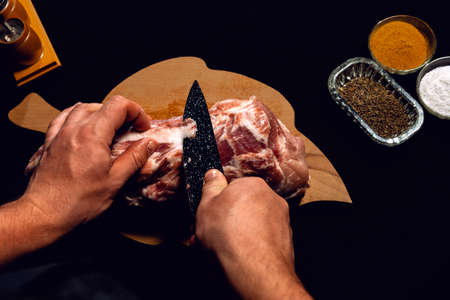 Raw meat, pork neck, the cook prepares the meat for marinating, cuts the lard.