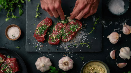 A skilled chef prepares raw meat with expert seasoning for a gastronomic feast, evoking a sense of culinary dedication.
