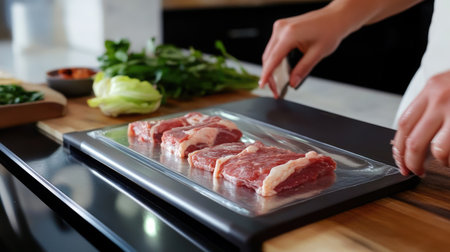 A pristine kitchen scene showcasing the preparation of fresh raw meat with vegetables and herbs, highlighting culinary artistry and meal planning.