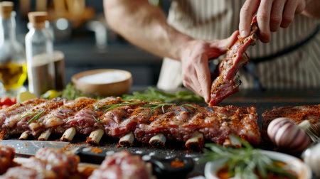 A chef seasoning pork spare ribs with a rub mixture before grilling, with ingredients neatly arranged on a table