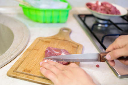 Woman cutting raw meat on small pieces with kitchen knife cutting board. Female cutting red beef filet on wooden board, holding knife in hand. Housewife is cooking at home interior. Concept: food