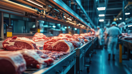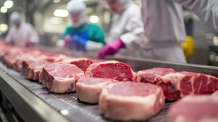 Conveyor belt carrying freshly cut steaks through a meat processing line, workers in the background wearing protective gear, ensuring safety and quality.