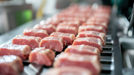 A close-up view of fresh cuts of red meat on a conveyor belt in a food processing facility, highlighting the clean and efficient production process.