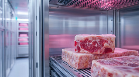 This image showcases neatly arranged blocks of processed meat in a high-tech refrigeration unit, emphasizing modern food storage techniques and hygiene.