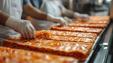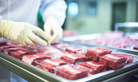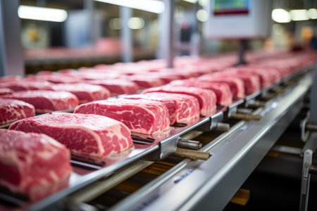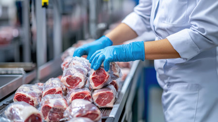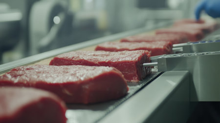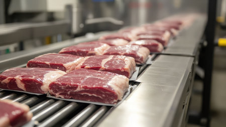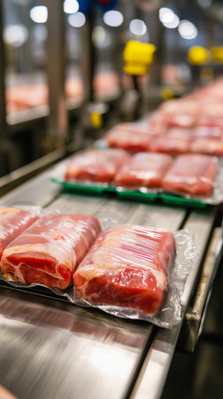 Freshly Packaged Red Meat on Conveyor Belt in Food Processing Facility for Quality Control and Packaging Production