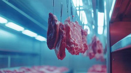 A visually striking image showcasing raw meat hanging in a chilled storage room, illuminated by soft blue lighting, highlighting freshness and quality.