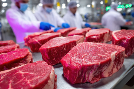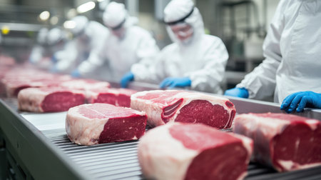 Fresh cuts of beef are aligned on a processing line inside a meatpacking facility. Workers are efficiently handling the meat for packaging and distribution, ensuring quality and safety in food production.