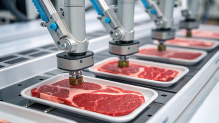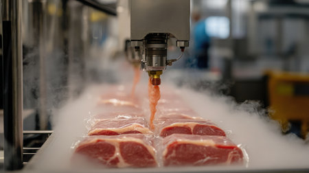 A vibrant array of fresh raw meat cuts displayed in a modern food preparation facility, showcasing quality ingredients ready for culinary excellence.
