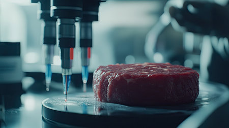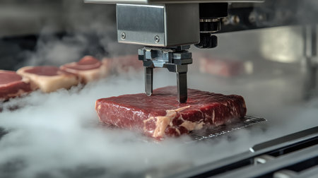 A close-up view of innovative food science technology as researchers use advanced machinery to examine a meat sample in a cutting-edge laboratory setting.