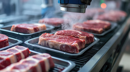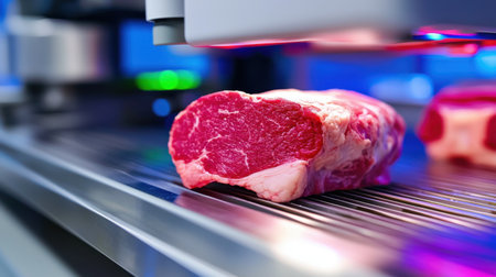A high-quality close-up of a raw beef steak placed on a conveyor in a food processing facility, showcasing modern technology and vibrant colors in the background.